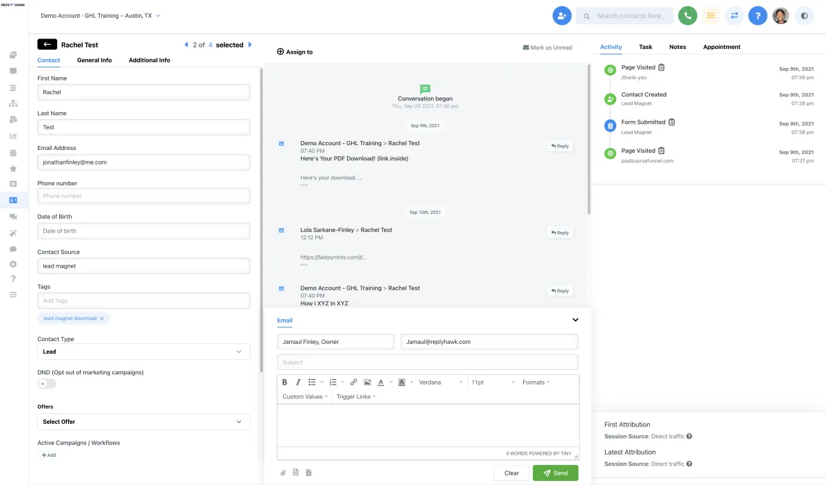 Create funnels, courses, websites, clients, and products. Send personalized messages that engage leads and spark sales.